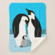 Antarctica wildlife of adult Emperor penguins with a baby chick on the Antarctic ice on blue background