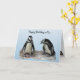 This birthday card features two adorable African Penguins standing on a rocky ledge. They are aquatic, flightless birds whose wings have become flippers. Each has a black stripe and black spots on the chest. The pattern of spots is unique for every penguin, just like human fingerprints. They have pink glands above their eyes and pink and black feet. Two more little penguins are inside. The text can be customised for your special occasion.