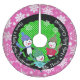 Penguins Holly Jolly Christmas holiday tree skirt features a beautiful design featuring a white snowflakes on hot pink background, a black ring, green centre with white polka dots, snowflakes of white, three adorable penguins with sweaters, winter hats, ice skates, and scarves, and white text that reads Have a Holly Jolly Christmas!