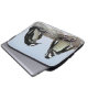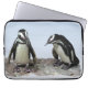 This laptop sleeve features two adorable African Penguins standing on a rocky ledge. They are aquatic, flightless birds whose wings have become flippers. Each has a black stripe and black spots on the chest. The pattern of spots is unique for every penguin, just like human fingerprints. They have pink glands above their eyes and pink and black feet.