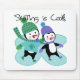 Two penguins ice skate on the frozen pond dressed in striped, colourful winter hats, scarves, and mittens and black text reads Skating is Cool on skating theme T-shirts, mugs, cards, bags, keepsakes, pillows, hoodies, stickers, and much more!