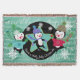 Penguins Holly Jolly Christmas holiday throw blanket features a beautiful design featuring a white typography Christmas text on a blue background, a black ring, blue star centre, snowflakes of white, three adorable penguins with sweaters, winter hats, ice skates, and scarves, and customisable white text that reads Have a Holly Jolly Christmas!
