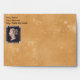 Features an image of the British "Penny Black" in mint condition on an old paper background. Add your own address. The Penny Black was the first adhesive postage stamp used in a public postal system. The Penny Black was issued in London on May 1, 1840. Before 1840 it was normal to pay for postage upon receipt of a letter. Postage was calculated by the number of sheets and the distance travelled. The idea of a pre-paid postage stamp was included in a set of proposals to reform the British postal system in 1837. Private postal systems may have used adhesive stamps before 1840. An engraving of Queen Victoria as a 15-year-old former princess was chosen as the design for the first stamp. It was believed that the design would be difficult to forge. All stamps of the United Kingdom British bear a picture or silhouette of the reigning monarch in lieu of the country name. All other postage stamps name their country of origin. The Penny Black was in use for only a little over a year. It was found that a red cancellation was hard to see on a black background and the red ink was easy to remove, making it possible to re-use stamps after they had been cancelled. In 1841,it was replaced by a stamp bearing the same design, the Penny Red, but printed with a reddish ink. The Penny Red was cancelled with black ink, much harder to remove. The Penny Black is not a very rare stamp. A total of 286,700 sheets with 68,808,000 stamps, were printed and a substantial number of these have survived, largely because envelopes were not normally used: letters in the form of letter sheets were folded and sealed, with the stamp and the address on the obverse. If the letter was kept, the stamp survived.