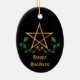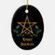 The ornament's deep black background serves as a canvas for a mystical star, illuminating the eternal struggle between light and darkness. The accompanying delicate decorative elements of leaves and red berries are not mere adornments but symbols of life and rebirth, resonating with those who walk the path of Wicca and pagan traditions. This oval-shaped ornament, with its witchy, pagan vibe, transcends mere decoration; it is a talisman of sorts, a reminder of the magick that permeates the season.
