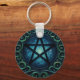 This whimsical keychain features a black pentacle surrounded by greenish blue cosmic skies finished as an oil paint print.