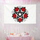 Black pentagram with pattern, decorated with blooming, red roses with leaves on white background. Tattoo style.