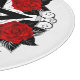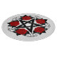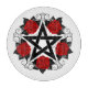 Black pentagram with pattern, decorated with blooming, red roses with leaves on white background. Tattoo style.