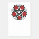 Black pentagram with pattern, decorated with blooming, red roses with leaves on white background. Tattoo style.
