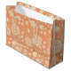 Woodblock pattern of peonies and wild tulips against a coral background.
