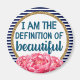 Add a little touch of cuteness to your kitchen or fridge with this inspirational peonies 'I am the definition of beautiful' .Features navy blue and white striped background with a gold circle and pink peonies on the bottom. Saying reads 'I am the definition of beautiful'. Makes a lovely fridge magnet to give your boring kitchen a little life.