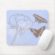 A brown outline of a peony and brown butterflies are on a blue background with faint silhouetted peacock feathers.