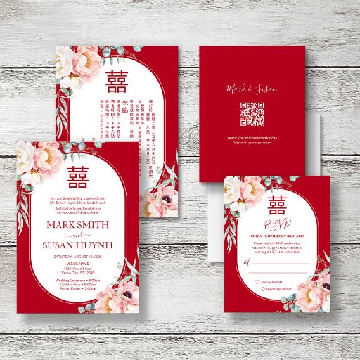 Triilingual Wedding Invitation - Peony on RedDesigned by Tracy Ta