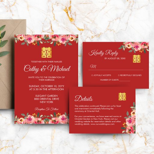 Peony floral double happiness Chinese wedding redDesigned by Joc H