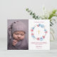 Blue And Blush Pink Floral Baby Baptism Thank You Card. Features a wreath of watercolor peonies and baby photo. Matching items available.