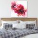 A vibrant, detailed peony flower with lush pink and red petals is surrounded by soft, flowing watercolor-like patterns
