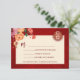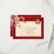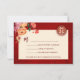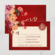 Red, orange and neutral tones peony flowers on a shimmering red background and a gold double happiness symbol. RSVP Chinese Wedding Card.