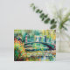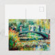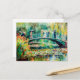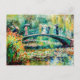 Impressionist painting of people standing on a garden bridge over a pond, with water lilies floating below in soft colours.