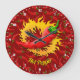 Red chili pepper with circle of flame. Red seamless pattern background. Custom text.