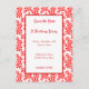 A red and white peppermint candy holiday pattern Save the Date on an editable template with script and block letters in red.