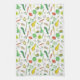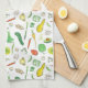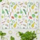 A bright and cheerful kitchen towel decorated with an all over vegetable pattern with squash, peppers, potatoes and more hand-drawn with ink and watercolor. Pretty gift or something new for your kitchen!