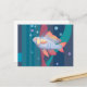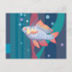 Postcard featuring underwater animal art, perch fish with red fins and tail swims in seaweed.