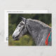 A photo portrait of a dapple grey Percheron draught horse mare, with a red, yellow and turquoise braided mane, photographed at a show in France.