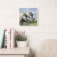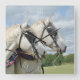 A clock with Roman numerals with portrait of a matching pair of Percheron grey draught horses at a ploughing competition, wearing harnesses with blue and red collars and blinkers, against a backdrop of fields and blue sky with fluffy clouds. Photography by ruralfrance.
