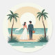 Includes 20 small stickers on one sheet. Celebrate your romantic beach wedding moment with this adorable sticker! A stylish couple in wedding attire stands hand in hand, gazing at the sunset by the ocean, flanked by swayingng palm trees.