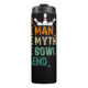 This graphic features a vintage-style design for a bowling enthusiast. It includes three bowling pins and the text 'DAD. THE MAN. THE MYTH. THE BOWLING LEGEND.' in stacked, multi-coloured fonts with a distressed look. It's a fun and celebratory graphic perfect for a father who loves to bowl.