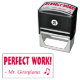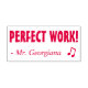 This fun rubber stamp design features the motivating message "PERFECT WORK!" and a customised educator's name. It also features a decorative musical note. It could be used by a teacher or educator when marking assignments, to acknowledge that the student has done well.