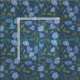 This floral patterned fabric features illustrations of periwinkle blue coloured flowers with green leaves set against a navy blue coloured background.
