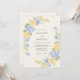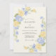 This delicate design features a soft cream backdrop adorned with an airy watercolor floral arrangement. Bright yellow roses mingle with clusters of periwinkle blue hydrangeas and soft green foliage to create a romantic atmosphere. Perfect for a seasonal outdoor ceremony, the palette evokes a fresh and elegant mood.