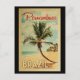 A uniquely retro mid-century modern Pernambuco Brazil art print in vintage travel poster style. It features a curved palm tree on sandy beach with ocean under a blue cloudy sky.