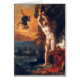 This is a reproduction of “Perseus and Andromeda” of 1853 by Eugene Delacroix. This is a classic treatment of the popular Greek Myth of Perseus coming to the rescue of the princess of Joppa, Andromeda. He was fifty-five years old in the year of this creation. He had burst upon the French artistic word two years before at the age of twenty-four with his “Barque of Dante” and became an immediate leader of the new Romantic movement. In contrast to the perfectionist Academics, Delacroix led the Romantics in the use of expressive brushstrokes being inspired by Rubens and Titan. He favored exotic scenes and emphasized colour and movement rather than clarity of line. Though hs subjects were full of passion and violence, he depicted them with a great clarifty. This painting is an oil on canvas and measures 17.24 by 12.68 inches. It is in the Staatgalerie Stuttgart, Germany.