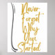 An inspiring graphic design featuring the phrase "Never forget why you started" in an attractive handwritten font with golden touches, suggesting elegance and motivation.