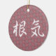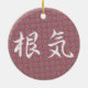 On a background of plum blossom, the Japanese kanji for 'perseverance' 'is written in flowing gyosho style script. Perseverance is 'konki' in Japanese, and plum blossom is a traditional symbol of perseverance, often beginning to bloom while there is still snow on the ground.
