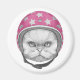 This design features a portrait of a Persian cat with a pink motorcyle helmet.