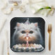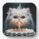 A fluffy white Persian cat wearing a birthday hat with a pink tongue ready to lick cake frosting