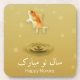 Persian New Year Happy Norooz illustration featuring a fish (symbol of life) jumping out of water; oriental mandala design in the background. New Year wishes in english and farsi.