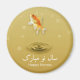 Persian New Year Happy Norooz illustration featuring a fish (symbol of life) jumping out of water; oriental mandala design in the background. New Year wishes in english and farsi.