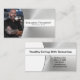Faux brushed steel sets off the background of this business card design featuring a photo placeholder on the left with template name and title on the right. The back includes a coordinated design and colours with text fields for the business name and details. Replace the placeholder photo with your vertical format photograph. Fill in the template fields, remove text or click customise to select a font style, size, and colour you like.The placeholder photo is courtesy pexels.com.