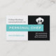 Personal chef minimalist eye-catching black, white, aqua business cards featuring a white chef cap - toque with a fork, spoon and knife on black background and the text “Personal Chef” in an aqua blue band. Perfect professional design for head cooks, personal chefs, culinarians, chef de cuisine, executive chef, chef manager or catering business.