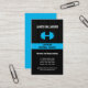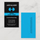 A graphically bold business card for a personal trainer, gym owner or coach. A silhouette of a bright blue dumbbell stands out against the rich black pinstripe background. Your title or business name sits in the striking blue bar underneath with your contact information below against rich black. Add any extra information on the attention-getting back. Available in alternate colours with matching products.