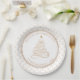 Personalise dinnerware for your annual Christmas Party. There is circular text with two templates so you can easily change all the text to your own words, name, initial, or monogram. This Christmas theme has a golden metallic filigree Christmas tree with beautiful curved lines and swirls and a star on top. The same tree is repeated in offset rows on white for a holiday background.