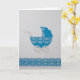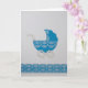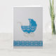 Personalise, Hand-cut cute blue baby stroller with white lace, wheels from pearls for the birth or baby shower of a baby boy on greeting card.