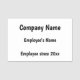 Plain and simple, employee name tags with text placeholders for Company Name, Employee's Name, and Employee since 20xx, year, date of hire. Any field can be customised with the text of your choice, on the provided template.