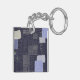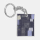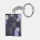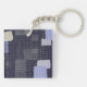 Dark blue keychain with traditional japanese sashiko printed design that resembles stiches and patches and custom name.