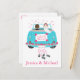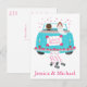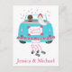This adorable Just Married wedding announcement post card features a bride and groom driving away in their blue turquoise wedding car with tin cans and flowers surrounded with pink hearts. The card can be personalised with the names of the bride and groom, a family or business name.