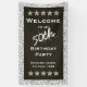 Personalise: Welcome to my 50th Birthday Party. A large black banner with white text and templates to make it easy for you to change to your own words. You can personalise all of the text using the supplied templates. The sign is trimmed with white stars and hash lines. Works well with a fiftieth, black and white, over-the-hill birthday party theme.
