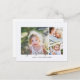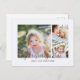 Personalised 3 family photos Universal Greetings Postcards featuring a stylish photo collage with 3 customised images, your greetings message in elegant handwritten script font, your name, date, year, message on the back in a modern and simple sans serif font.